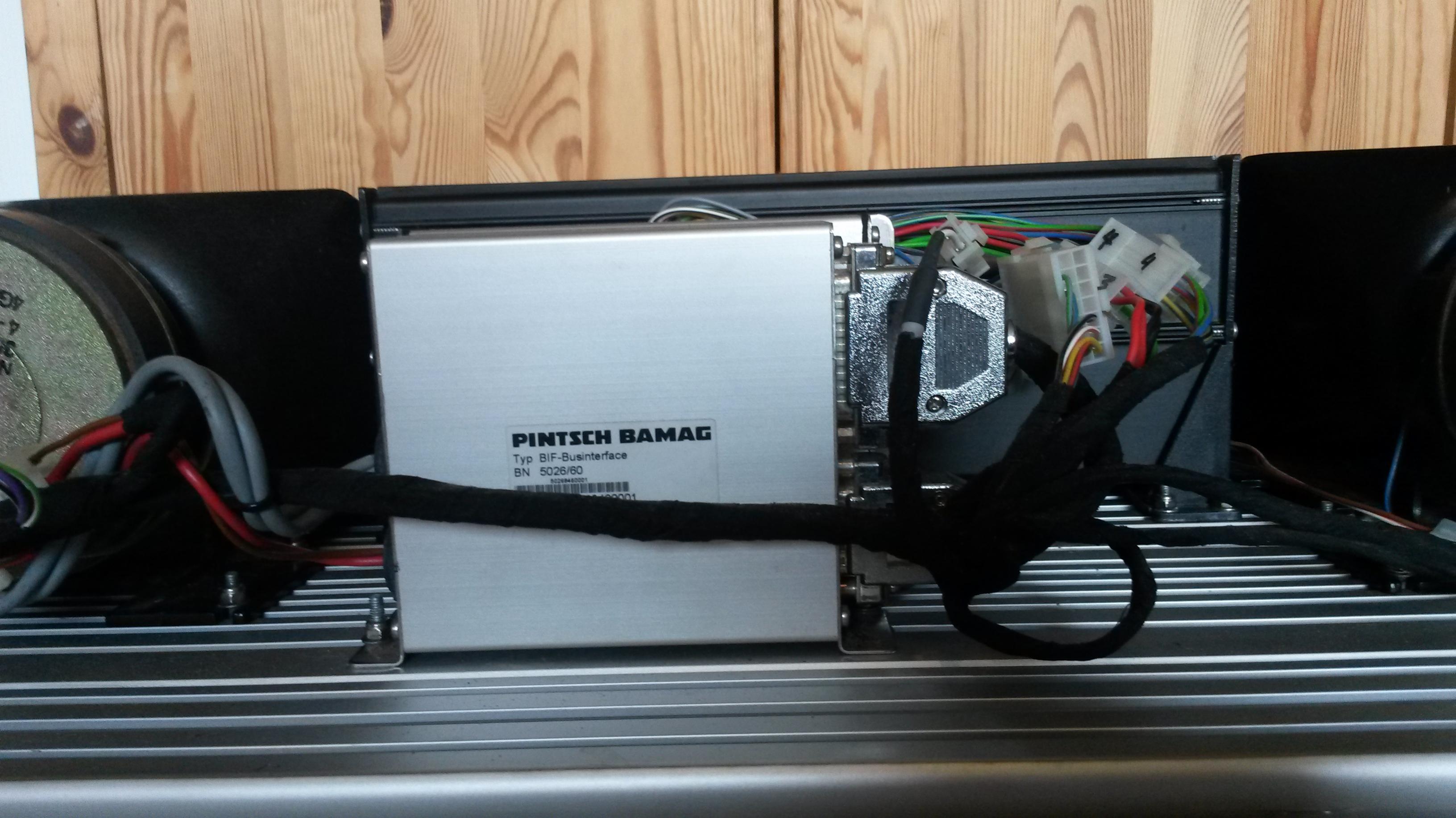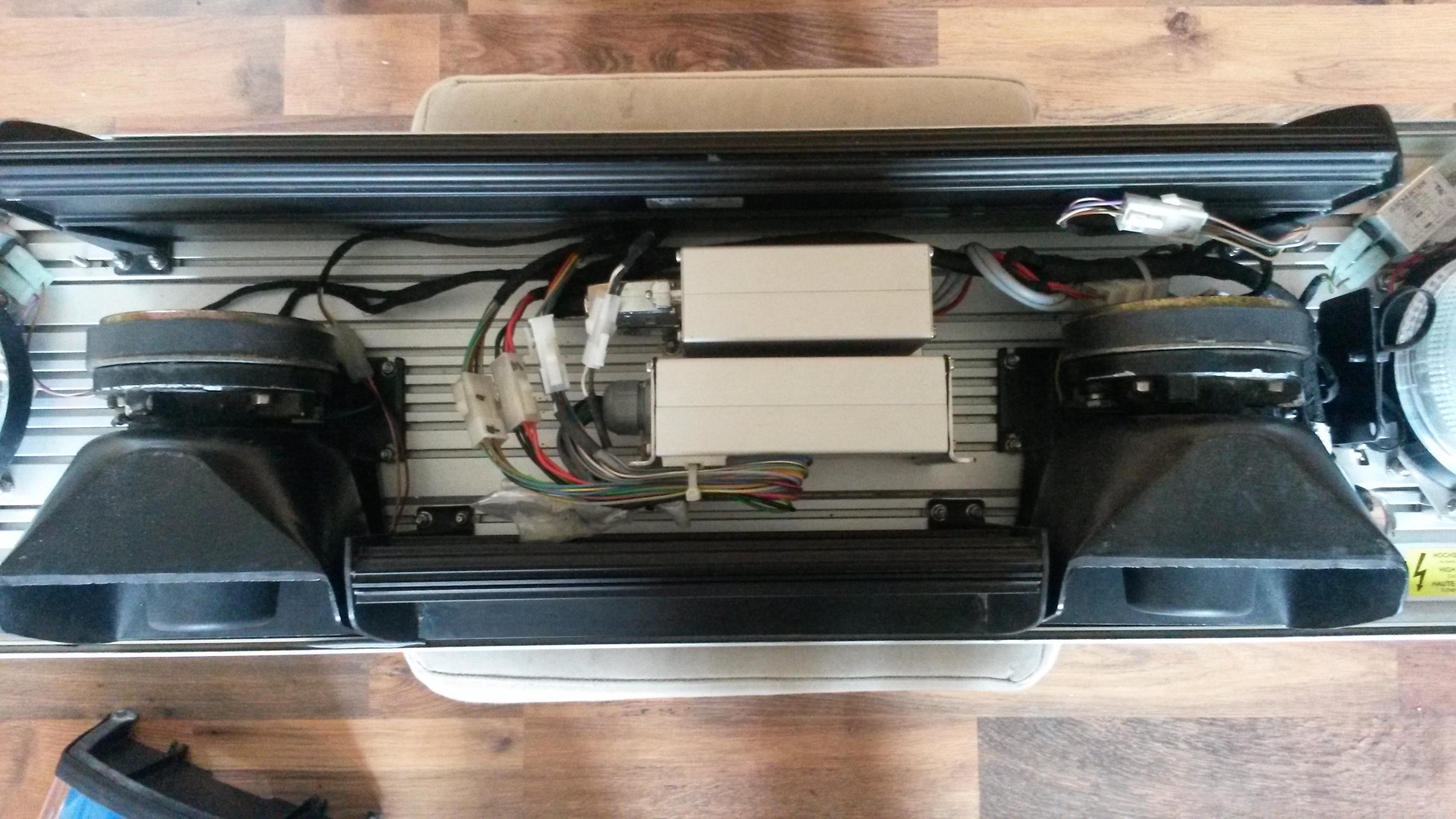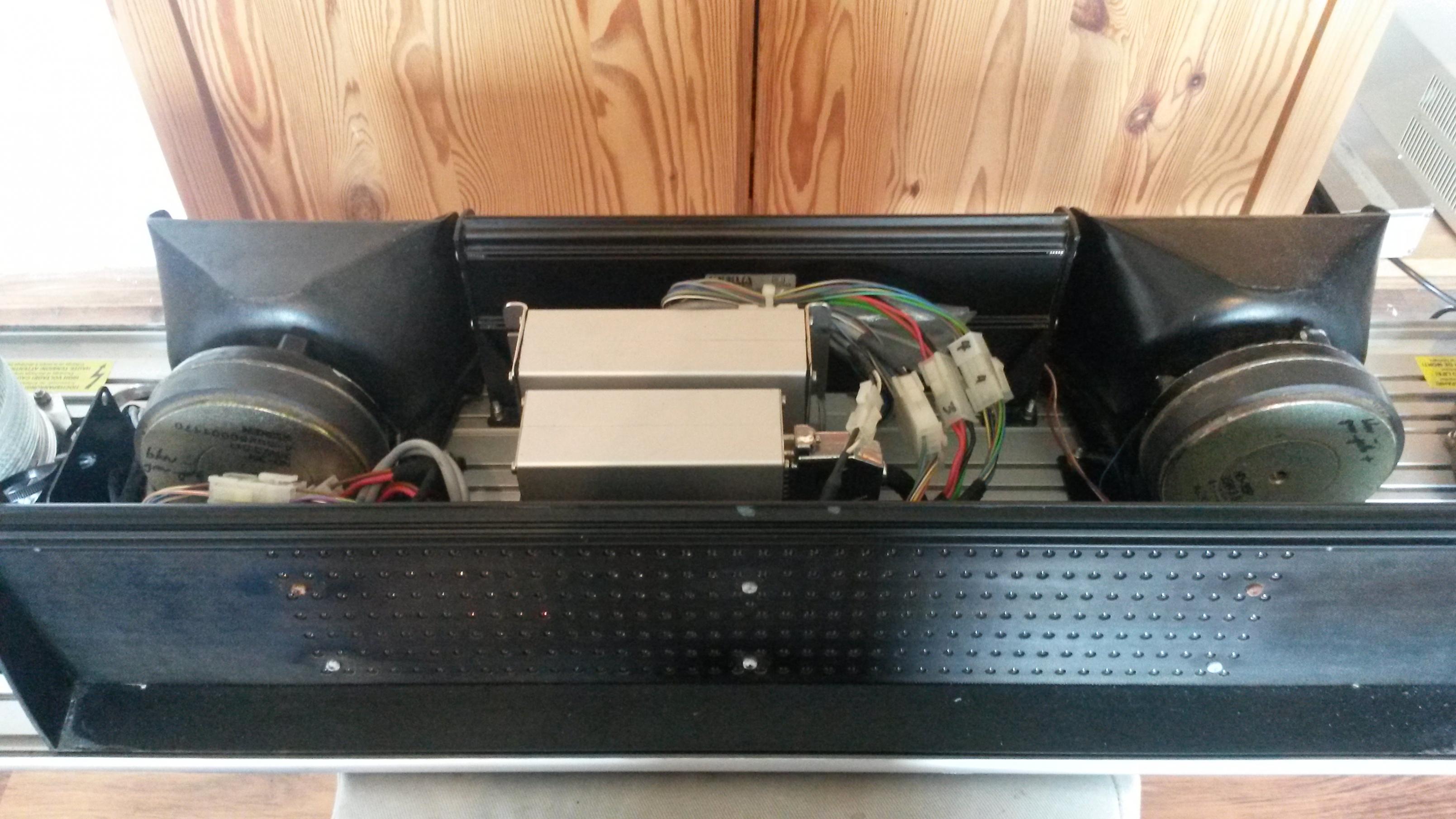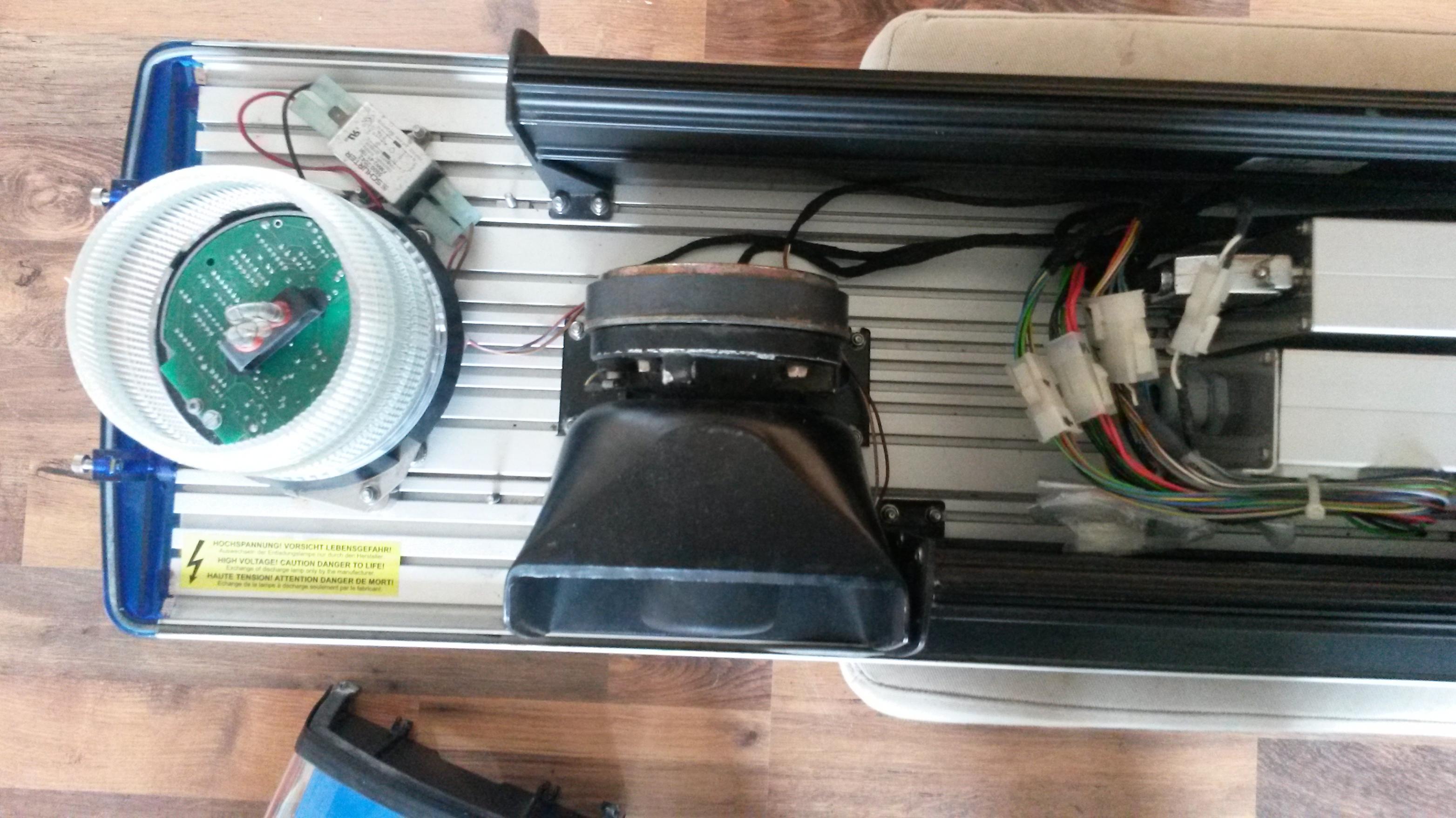 Linker (in Fahrtrichtung gesehen) Lautsprecher, Entstörfilter und Blitzmodul.