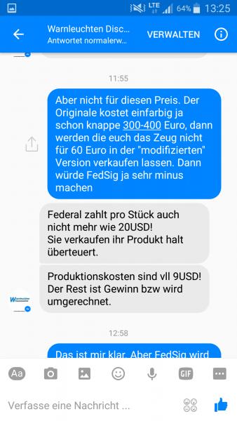 Gestern entdeckt: http://warnleuchten-discounter.de/Da...-S2-MultiColor Wird sich um die Fakes handeln oder? Hab die drauf hingewiesen aber sie probieren sich das gut zu reden und meinen, dass FedSig auch in China baut und man es aldo nicht wissen kann. Aber dass der einfarbige originale 300-400 Euro kostet und der mehrfarbige angeblich-origina nur 60 kosten soll, glaub ich da nicht dran. Da würde sich FedSig ja das eigene Geschäft kaputt machen. Mein Kommentar unterm Facebook Beitrag haben sie leider gelöscht, weil sie es nicht hören wollten und der Öffentlichkeit preisgeben wollten. Im Privatchat auch eher weniger bereit zu schreiben. |