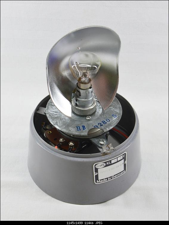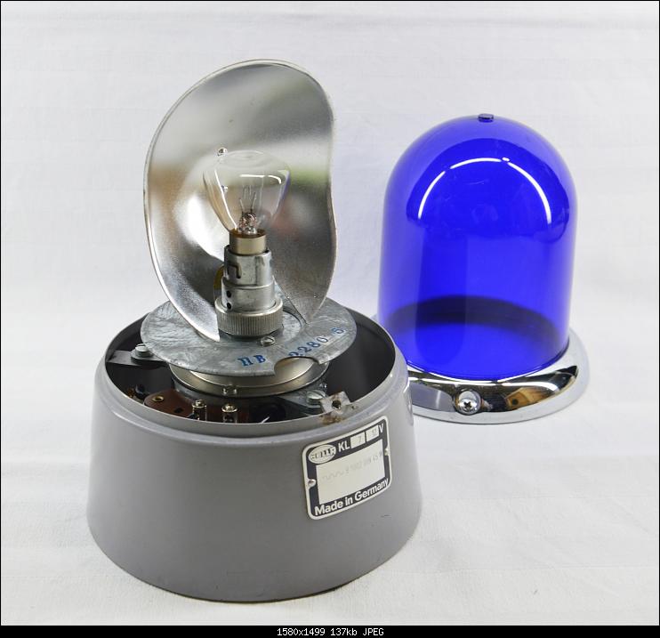 Es handelt sich um eine Hella KL 7 12V, welche noch nie verbaut war. Die Kennleuchte wurde ursprünglich als Ersatzteil für ein Fahrzeug einer Freiwilligen Feuerwehr angeschafft. Da sie bis Außerdienststellung des Wagens jedoch nicht verwendet wurde, bekam sie der Käufer des Fahrzeugs. Dieser bewahrte sie geschützt in einer Vitrine auf. Schlussendlich wurde die Leuchte in einem Hausflohmarkt verkauft (vermutl. Verlassenschaftsauflösung), wo ich sie durch Glück erstehen konnte. Mehr als einmal feucht abwischen hatte die Leuchte nicht notwendig, es sind nur vereinzelt kleine Kratzer zu sehen. Auch die jungfräulich anmutende originale 45 W-Glühlampe ist noch vorhanden. Ein weiteres Indiz, dass die Leuchte nie verbaut wurde, ist der Sockel, auf dessen Unterseite man keine Spuren von Schrauben oder sonstigen Befestigungsmitteln erkennen kann. Auch der Motor sieht sehr neu aus, abgesehen von ein bisschen Rost. Die Schleifkohlen sind noch relativ groß, und innerhalb der Motorabdeckung war kein Abrieb zu finden. Und natürlich ist sie, wie für Leuchten dieser Zeit typisch, relativ flott unterwegs. ![]() |