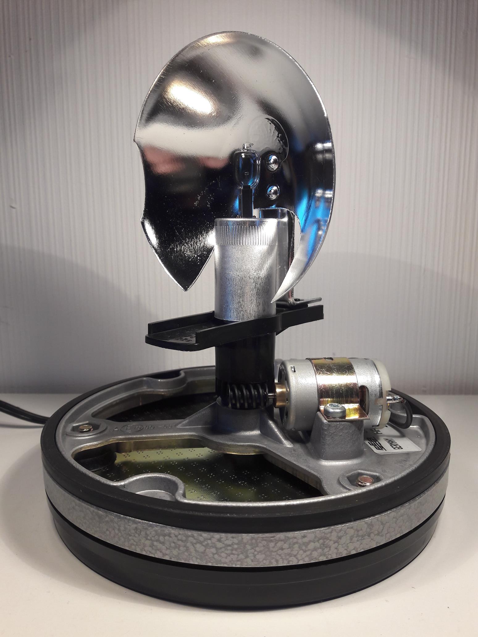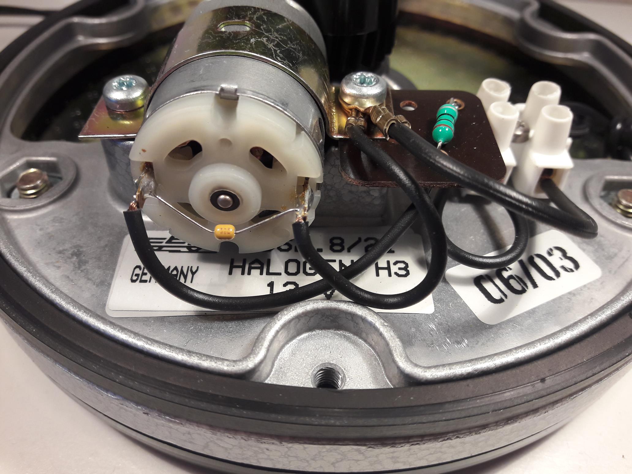 Um das feststehende H3-Leuchtmittel dreht sich ein verspiegelter Reflektor, der durch ein Zahnrad von einer Schnecke angetrieben wird.