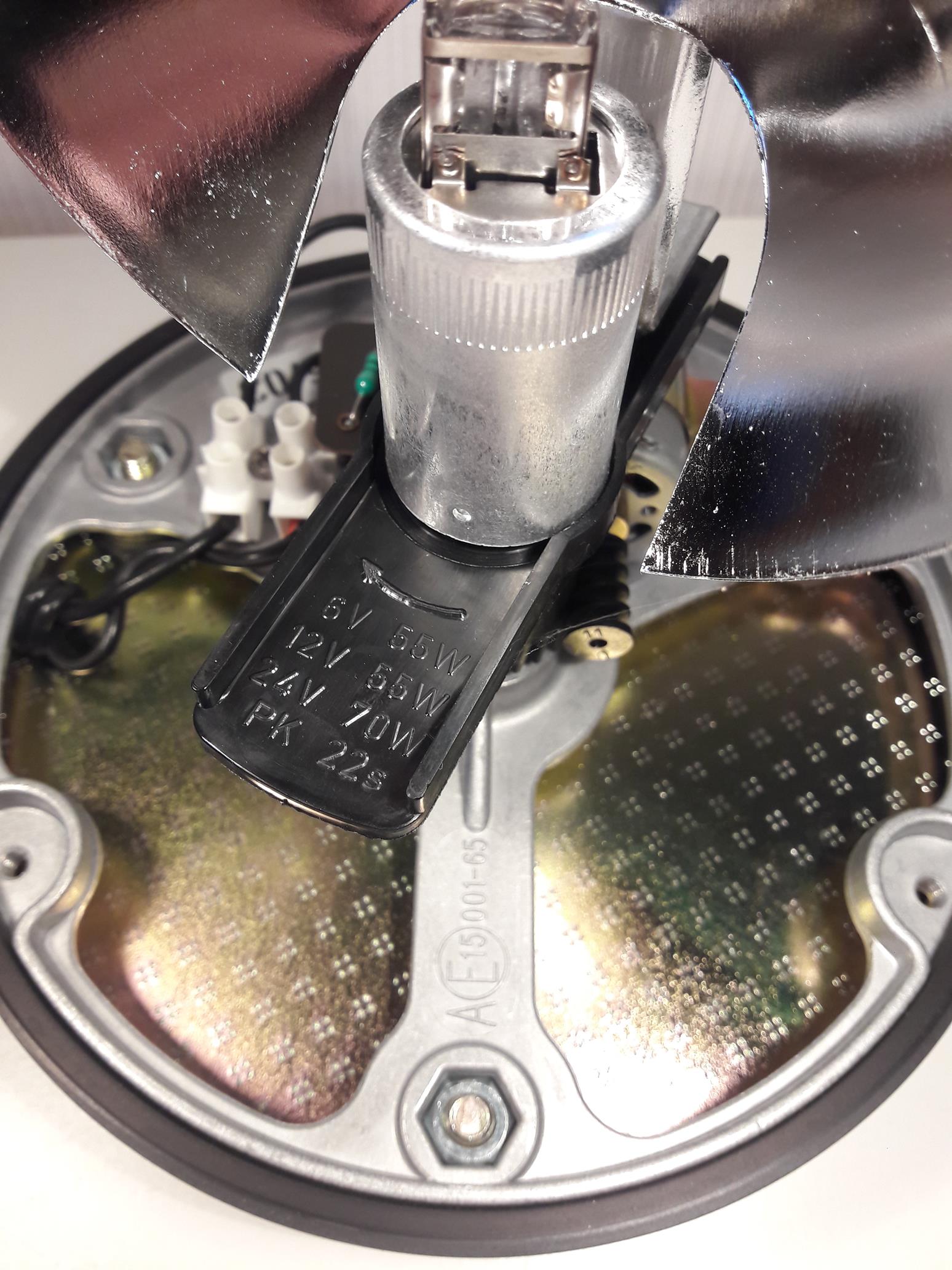 Der Reflektor ist auf einer schwarzen, T-förmigen (von der Seite gesehen) Kunststoffaufnahme verschraubt, auf der vor der Lichtaustrittsseite Angaben zur Drehrichtung und möglichen Leuchtmitteln zu erkennen sind.