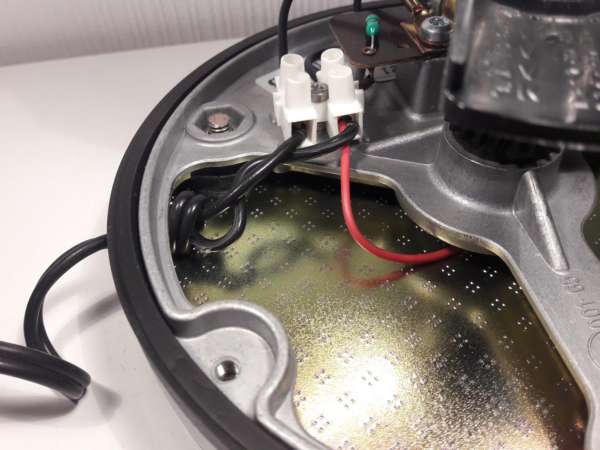 So ist u.a. eine Lüsterklemme als Schnittstelle der leuchtenseitigen Verkabelung und Stromzufuhr von außen verbaut.
