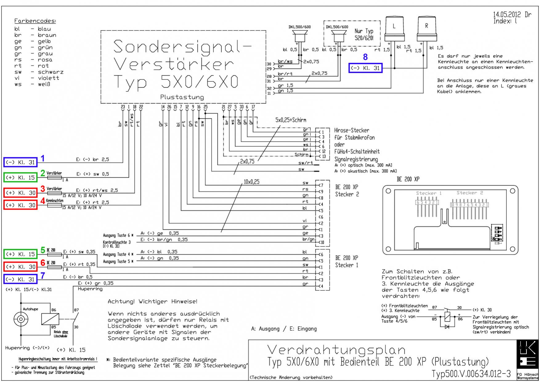 ich bin recht neu hier im Forum und wende mich gleich mal mit einer Frage an euch. Ich möchte eine mobile Sondersignalanlage (bestehend aus Hänsch BE200 und Hänsch Sondersignalverstärker 620) bauen. Dank dem Verdrahtungsplan ist mir die Verkabelung zwischen Bedienteil und Verstärker bekannt. Nur mit der Stromversorgung tue ich mir etwas schwer. Besitze da leider auch nicht gerade ein Expertenwissen. Durch die Stromeinspeisung via Zigarettenanzünder schaffe ich mir jeweils einen Plus- und einen Minuspol (vermutlich werde ich eine powerCON-Buchse verbauen). Auf dem folgenden Bild habe mich mal die benötgiten Anschlüsse markiert. Das sind ja ziemlich viele. Kann ich nun alle Anschlüsse für Kl. 30 auf meinen Pluspol und alle für Kl. 31 auf den Minuspol legen? Und wie gehe ich mit Kl. 15 (Zündung) um? Ich bin für jeden Rat dankbar! Freue mich auf eure Antworten