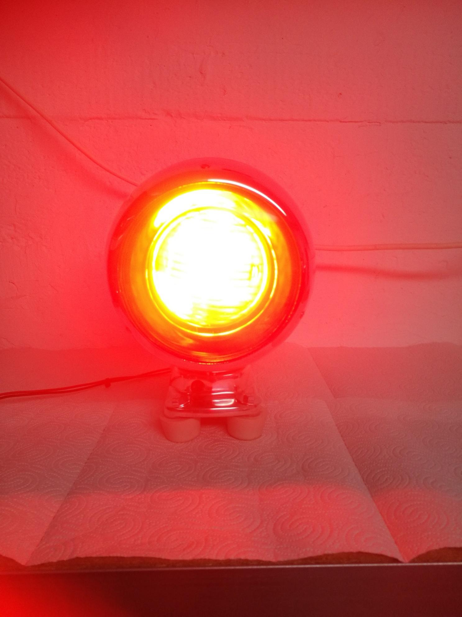 Das Besondere ist, dass diese Leuchte nach vorne gerichtet ist, sich aber trotzdem im Kreis dreht. Somit wird durch einen Spiegel ein Rotationseffekt erzeugt.