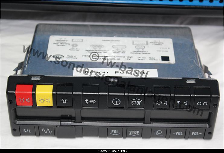 Seitenansicht mit dem Typenschild-Aufdruck auf der Haube. Anders als bei der kurzen Xenonhaube wurde in der langen Version eine Optik wie bei der Drehspiegelhaube verwendet. Zur Steuerung wird ein passendes Bedienteil aus Hessen der Version 3.21B inkl. ASW- und Yelptaste genutzt. Eine Besonderheit der Anlage ist die Frontblende. Diese besitzt neben einem BSX-F-Ausschnitt auch einen Ausschnitt für den ASW. Leider sind solche Blenden nur selten verbaut worden und mittlerweile schwer zu finden. Ich konnte meine Blende nach vielen Jahren suchen zufällig bei eBay-Kleinanzeigen finden. Frontansicht mit aktiviertem BSX-F, ASG mit WL LED und ASW. Heckansicht mit HWL-GL und ASG „Stop Polizei“. Mein Fazit zur Anlage: Nahezu komplett vollgepackt bleibt kaum noch Platz in der Anlage. Die "neue" und in 1.400mm doch eher selten verbaute Xenontechnik, in Verbindung mit ASG mit Glühlampe ist eine optisch sehr interessante Kombination, die mir persönlich sehr gut gefällt. Die seltene Frontblende rundet das ganze ab. |