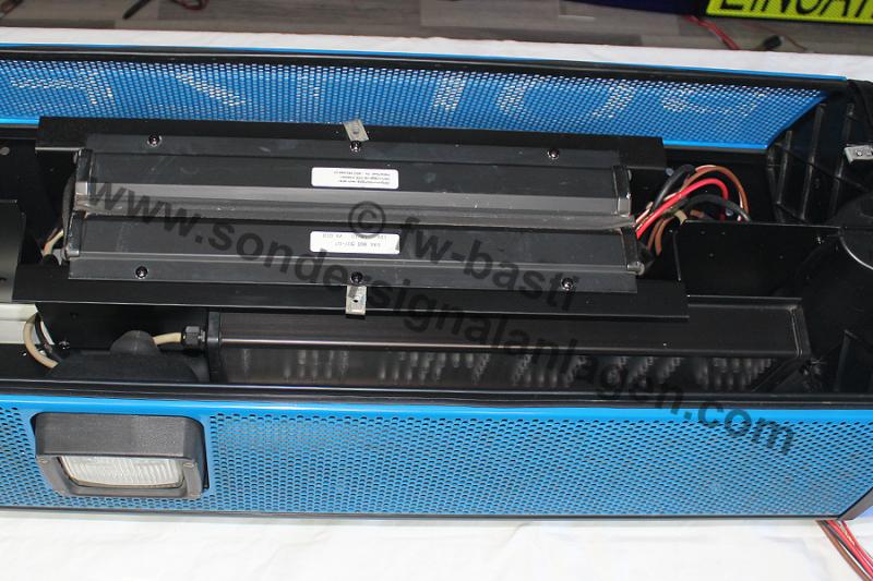 Erste Besonderheit ist die Bedieneinheit. Hier wurde Anstatt der Warnblinker bzw. HWL-GL Taste eine ASW Taste verwendet. Der ASW selbst steckt auf selbigem Ausgang. Kurioserweise ist die Bedieneinheit trotz Werksaustausch älter als der Balken an sich. Ansonsten ist die Bedieneinheit gleich zu den allseits bekannten. Eine weitere Besonderheit ist der Kabelsatz aus dem Balken, der im Vergleich zum normalen Kabelbaum deutlich verlängert ist. Für die Stromversorgung wurde ein VW-Stecker verwendet, diesen musste ich leider entfernen, da sich kein Gegenstecker auftreiben ließ. Frontansicht mit aktiviertem ASW und ASG LED "Stop Polizei“ in Spiegelschrift. Heckansicht ASG LED "Bitte Folgen". Noch eine Besonderheit, die ich so bisher noch nicht kannte: Der LED ASG, welcher das selbe Gehäuse wie eine Vollmatrix besitzt, wurde wegen dem ASW weiter nach außen gesetzt. Ein BSX kann in diesem Falle nicht mehr montiert werden. Innenansicht nach der Restauration mit Fokus auf der Montage des ASG-LED. Die Verschraubungspunkte für diese Montageart sind bei allen Anlagen mit dem neueren ZSE Halteblech vorhanden. Mein Fazit zur Anlage: Ein seltenes Stück, wenn man bedenkt, das es aus Hamburg nur sehr wenige bis keine Anlagen aus dem Polizeibeständen in Sammlerhände schaffen. Ich vermute, dass es sich um ein Unfallfahrzeug gehandelt hat, welches dann komplett verkauft worden ist. Leider konnte auch der Verkäufer keine Angaben mehr machen, er hatte den Balken auch schon längere Zeit eingelagert gehabt. Wenn auch die Ausstattung eher spartanisch im Vergleich zu den anderen Anlagen meiner Sammlung erscheint, so hat diese RTK für mich einfach einen eigenen, besonderen Charme und ich bin sehr froh, eine originale Polizei Hamburg Anlage mein Eigen nennen zu können! |