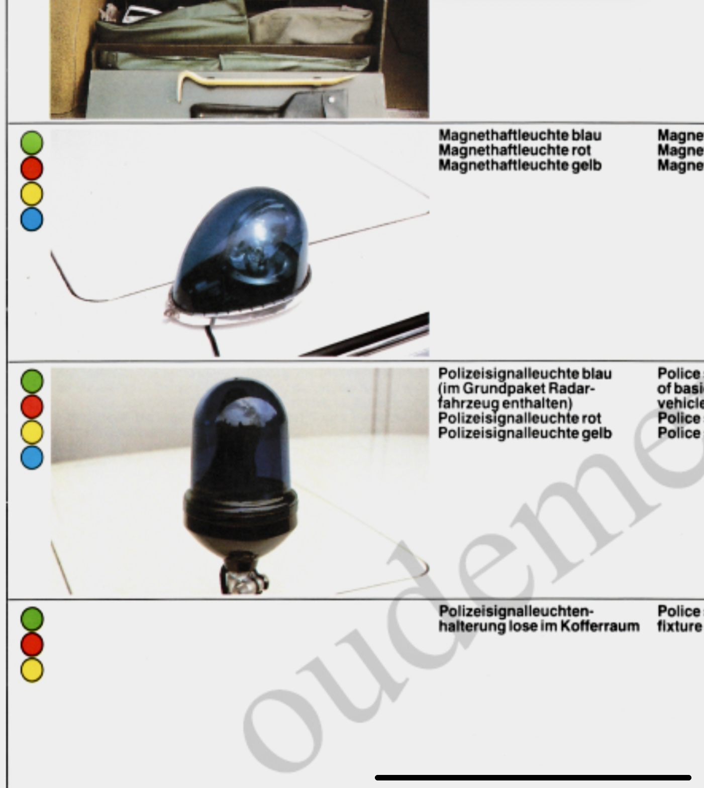 Schon sehr interessant, dass Mercedes bereits 1982 Magnetleuchten angeboten hat. Ebenfalls interessant, die Möglichkeit, rote und blaue Hella KLJ 60 zu bekommen