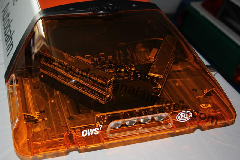 Seitenansicht - Verbaut sind neben den KL-LR Modulen noch Alley-Lights und Blinker nach vorne und hinten. Diese sollten ja soweit bekannt sein, daher verzichte ich hier auf weitere Detailfotos. Ganz Interessant könnte für den ein oder anderen noch ein Blick ins innere sein. Die OWS besitzt keine ZSE, sondern einen von Hella konfigurierten, vereinfachten Kabelbaum. Masse wird zentral an zwei Massesternen gesammelt, alle Lichtkanäle werden mit einem eigenen Kabel für die + Versorgung an den Modulen direkt angesteckt und dann nach außen geführt, somit lassen sich alle Module einzeln schalten. Alle Kabel sind in schwarz ausgeführt, jedoch mit der Funktion beschriftet, was den Anschluss natürlich deutlich erleichtert. In der Mitte befindet sich die Masterelektronik für die Blinker-Module, die Module laufen im Warnblinkertakt im Auto-Run. Langzeitbelichtung und Fazit: Wie auch die anderen beiden Autobahn Balken macht die kleine OWS7 auch wieder etwas her. Zwar besitzt diese kein RWS wie die anderen, dafür jedoch die zusätzlichen Warnblinker, die auch gar nicht schlecht sind. Gerade durch den orangenen Deckel passt sie aber wunderbar zu meiner OWS6 und zeigt sehr schön die damalige Weiterentwicklung bei Hella. |
