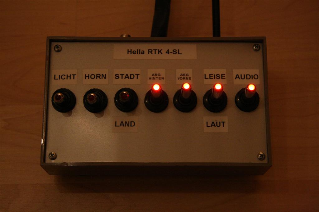 -Kabelbaum+Bedienteil Eigenkonstruktion. Schaltbare Funktionen: Rundumleuchten, Sondersignal, Stadt-Land, ASG hinten, ASG vorne, Laut/Leise, Front-Strobes.