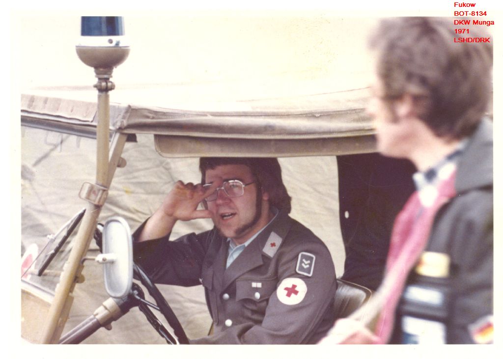 Da habe ich tatsächlich noch ein Farbfoto von "meinem" Fukow gefunden. Laut Auszeichnungsborte muss es zwischen 1971 und 1976 aufgenommen worden sein. Die originalen Spiegel hatte ich (verbotenerweise!) wegen der besseren Sicht gegen solche vom VW-Bus ausgetauscht. Und das Blaulicht hat: Einen Chromring! Vielleicht wurde es auch von der KatS-Werkstatt in Lette so repariert, nachdem das originale Blaulicht bei einer zügigen Geländefahrt vom Ast eines Baumes abgesäbelt worden ist?